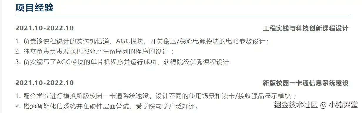 对于应届生来说,这个模块很重要,HR可以通过这个模块大致了解到你具备哪一些个人能力。有写小伙伴说自己没有项目经验,其实不然,宽泛的来说,每一个人都有项目经验。只是有一些小伙伴没有意识到。比如我是一个正在应聘编程开发岗位的应届生,项目经验可以写上自己平时老师布置的一些编程作业等等,甚至立刻去网上找一个项目,然后把这个项目熟悉起来,这样也可以写到简历里面去。当然,前提是你一定要对你写的项目熟悉,不论是自己做的还是网上找的。