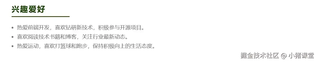 这一个模块就是小伙伴们自由发挥的,但是请注意,我还是建议你写上的爱好和你的岗位有一些关联。很多小伙伴一来就写:喜欢看电影、旅游等等,这好像和岗位没有太大关系,作用不大。加入你应聘的是一个什么技术类岗位,你就可以写,平时喜欢逛技术论坛,撰写一些技术文章之类的。