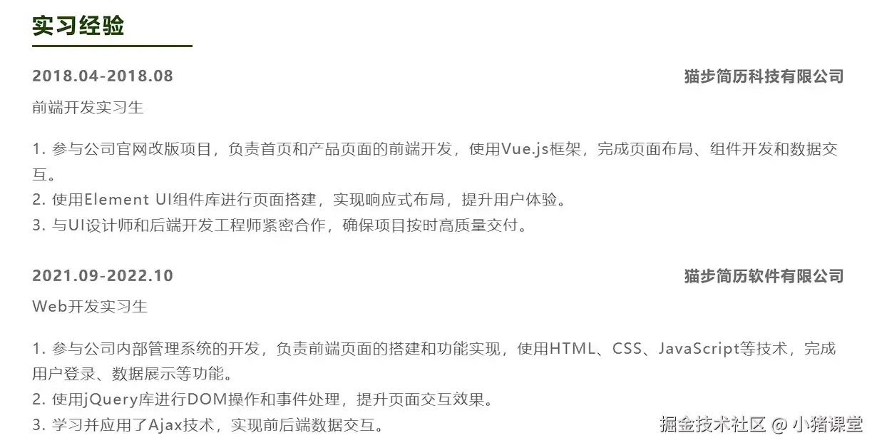 - 实习内容:尽量写上与你岗位相关联的东西,我就见过一个一些小伙伴,比如他求职的是一个技术岗位,实习经历里面却写了一个当服务员的实习经验。这样适得其反,这种毫无关联的实习经历可以简单提一下甚至可以不写。