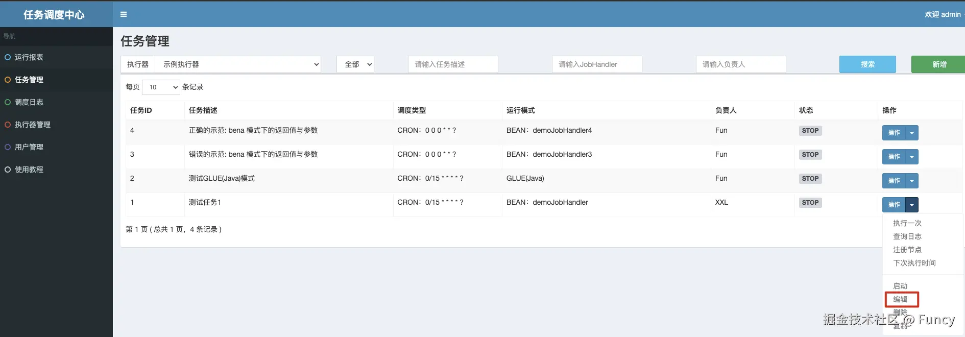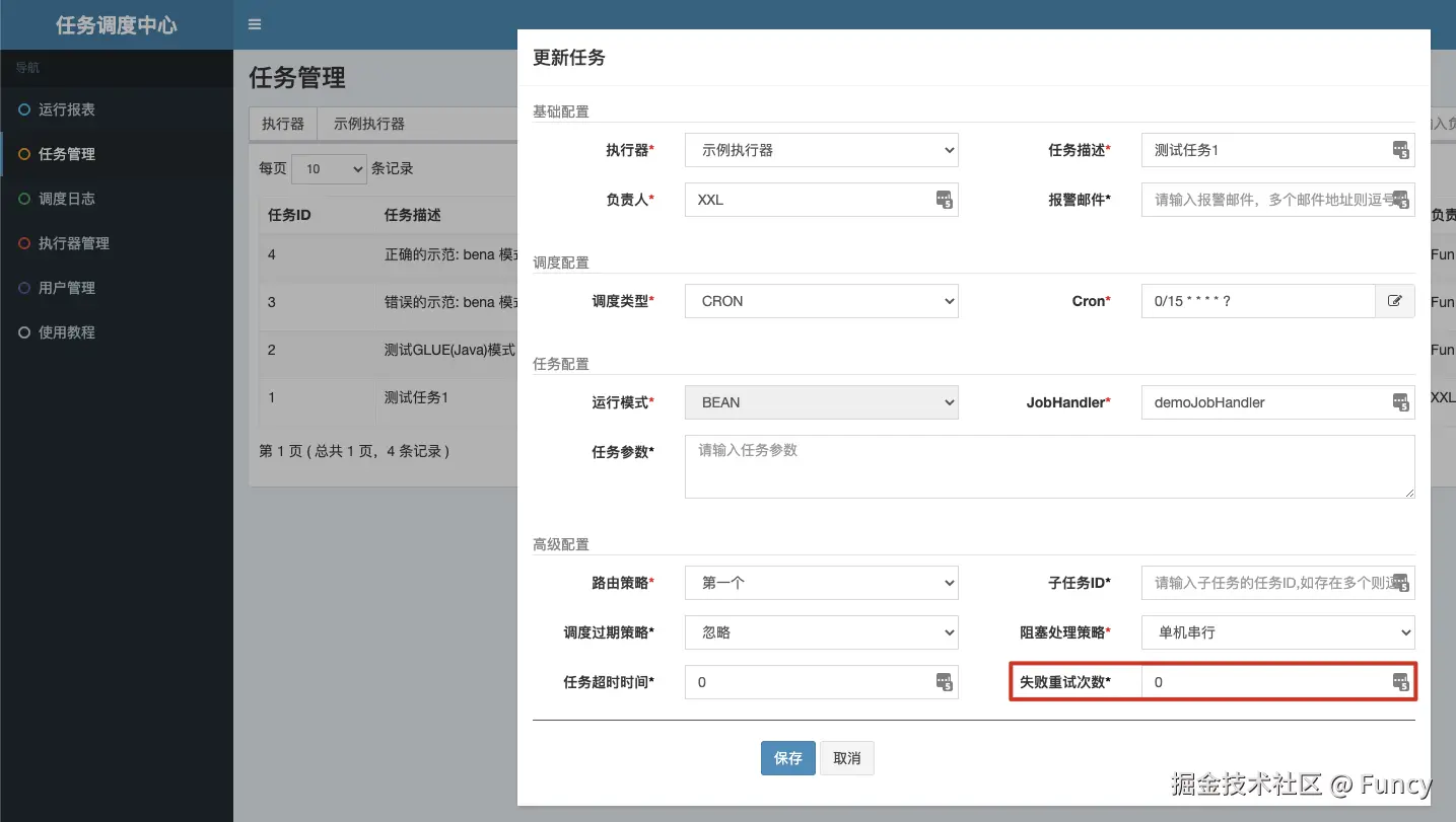 JobTriggerPool:任务的触发线程,用来把需要执行的任务提交到执行器JobRegistry:任务执行器注册监听,用来监听执行器注册操作,及时移除无效的执行器JobFailMonitor:失败任务监听,用来监听失败任务,发送告警,对于重试次数大于0的失败任务会发再次触发执行JobComplete:任务完成监听,用来监听任务是否完成,把长时间处于运行中的任务标记为失败JobLogReport:任务报表,用来汇总任务的整体执行情况,也是管理后台“运行报表”菜单的数据来源JobSchedule:任务调度,用来获取接下来要执行的任务,将这些任务提交给触发线程