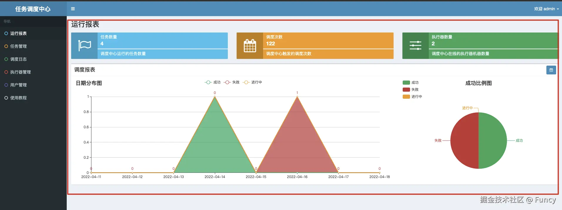所谓的报表处理,就是汇总任务的执行情况(总数、成功数、失败数等),然后在管理后台首页进行展示: