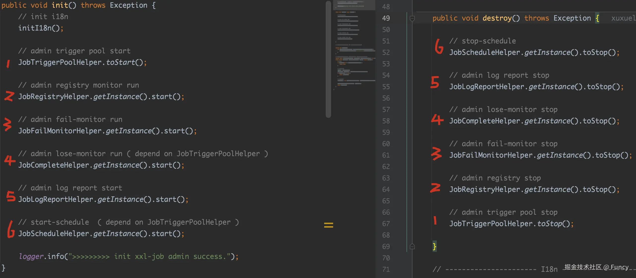 而实际上,XxlJobAdminConfig的afterPropertiesSet与destroy两个方法就是xxl-job启动与关闭的关键所在,而这两个方法都是调用的xxlJobScheduler的方法,接下来我们就来分析XxlJobScheduler#init与XxlJobScheduler#destroy方法。