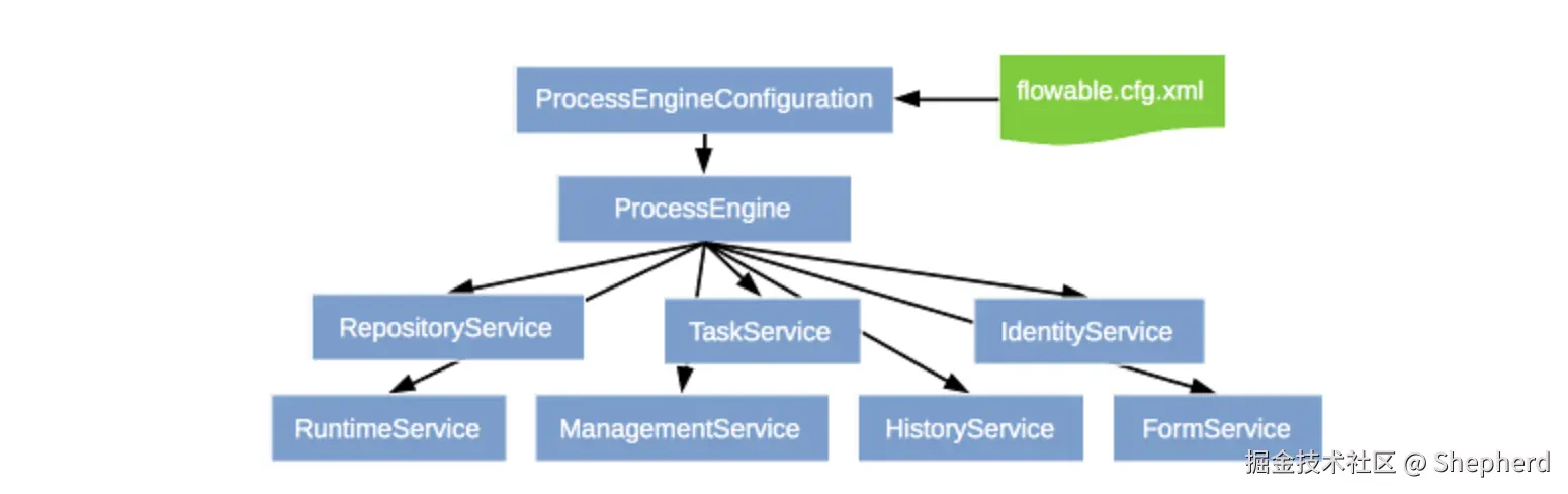 ProcessEngine:整个Flowable引擎的核心入口,通过它可以获取所有Service