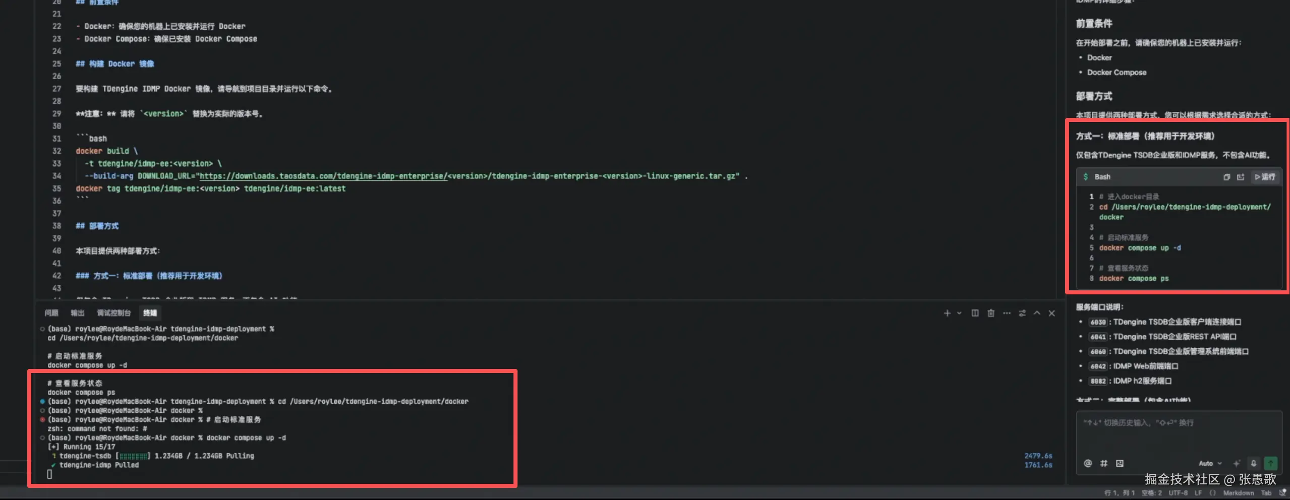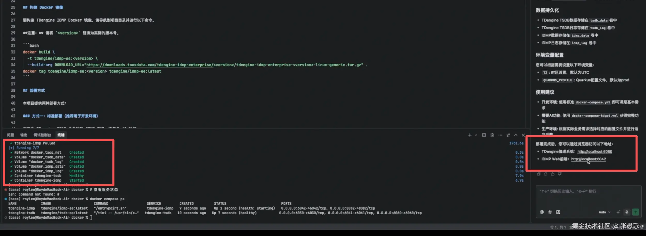 在右侧 AI 对话框中输入:通过 readme 文件,部署 TDengine IDMP,输出后 AI 会根据问题以及当前文件目录进行检索和分析,给出相应的安装步骤。