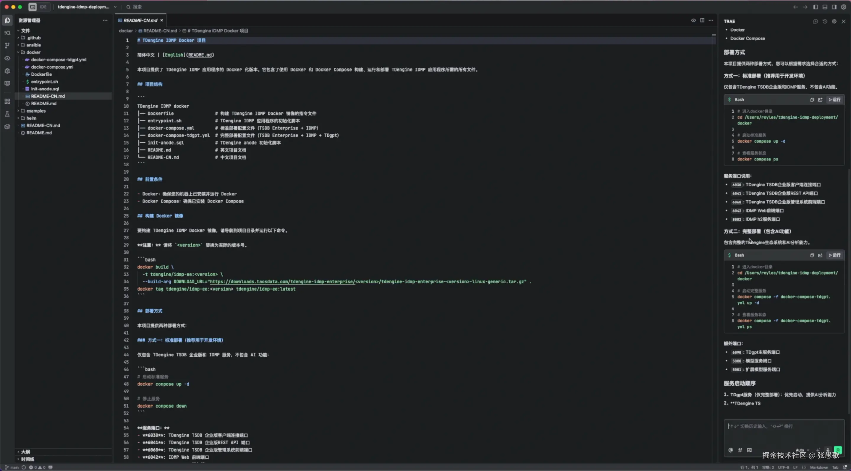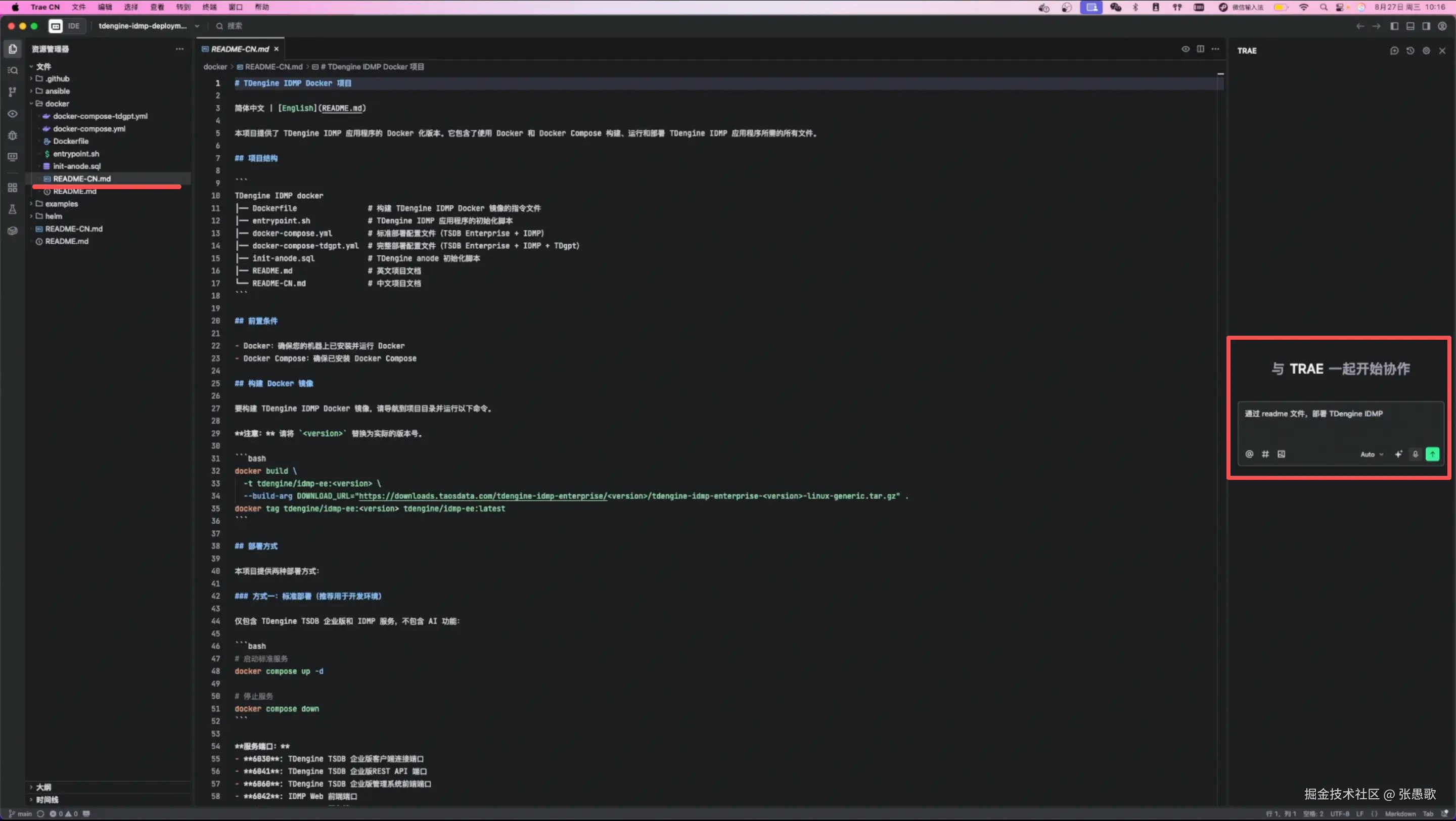 我本身混迹在 TDengine 开源社区,经常会下载新版的 TDengine 数据库来体验新的功能,上个月 TDengine 官方发布了 TDengine IDMP,可以基于采集的数据自动生成面板、报表和实时的数据分析,往常我都是使用 macOS 的安装包进行体验,但这个产品在官方文档中提示需要依赖 TDengine TSDB-Enterprise 3.3.7.0+,想要在不升级本地版本的同时体验新的产品,只能通过 Docker 来尝试,但我本身不熟悉 Docker ,所以我想到用 TRAE 来帮助我通过 Docker 部署 TDengine IDMP。