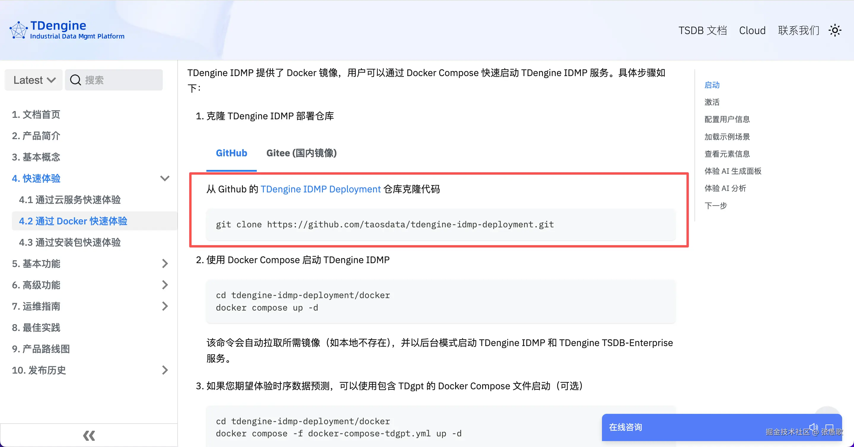 首先访问 TDengine 官网,在首页点击“下载 IDMP”进入官方文档,点击左侧导航栏“通过 Docker 进行快速体验”,根据文档的第一步进行操作,克隆 GitHub 上 idmp 的代码仓库。