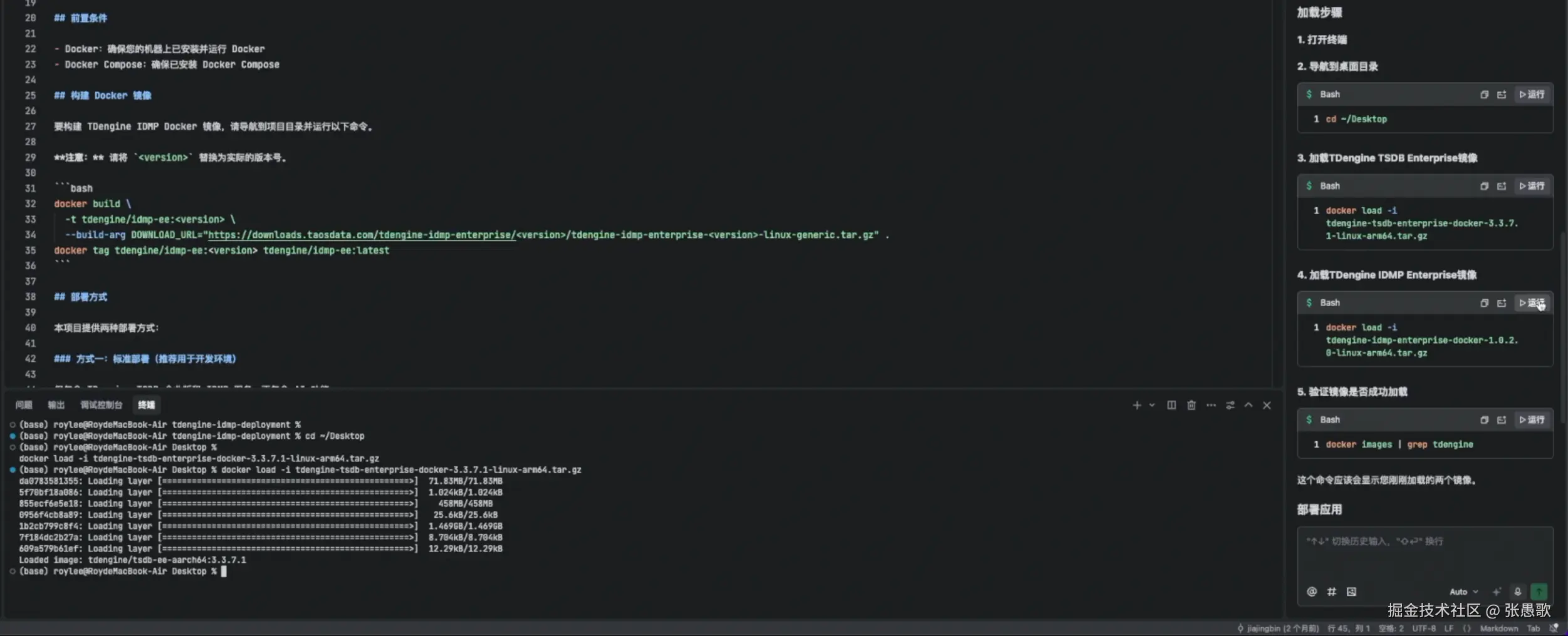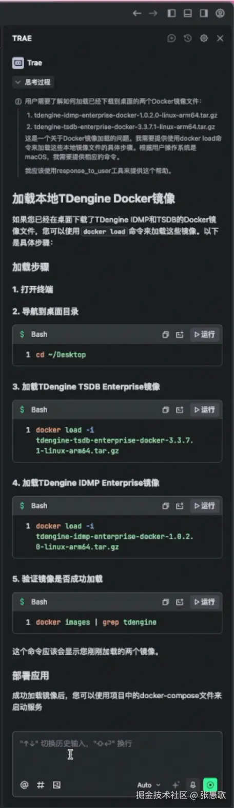 如果觉得命令行直接构建镜像时间比较长,TRAE 也可以通过本地的安装包进行安装部署,在 TDengine 下载中心选择对应版本、平台、架构的安装包下载到本地之后,我们返回 Trae。直接在右侧对话框提问:桌面已经下载了 IDMP 和 TSDB 镜像,怎么加载?