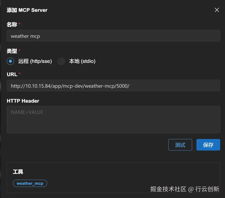 打开ChatBox添加一个MCP Server,将URL贴入URL框,点击"测试",没问题最下面会罗列出该MCP提供的工具函数名称,也就是mcp_tools中定义的name名称,点击"保存"