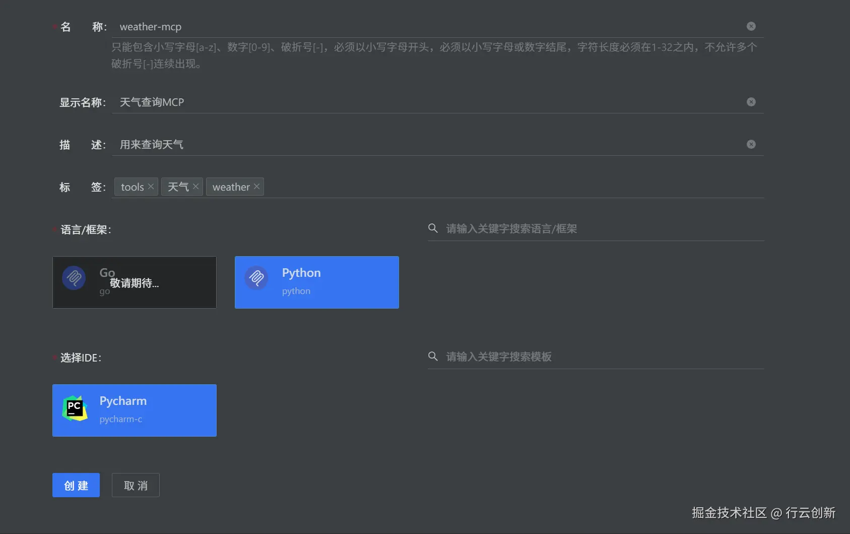 填写mcp server相关信息,给他加一些标签以方便后面大模型认识它,点击"创建"