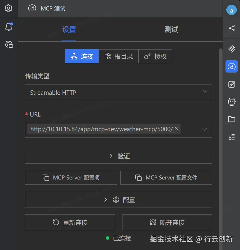 服务器启动后,你可以通过API调用来查询天气,通过侧边栏测试功能来验证我们写的代码没有问题