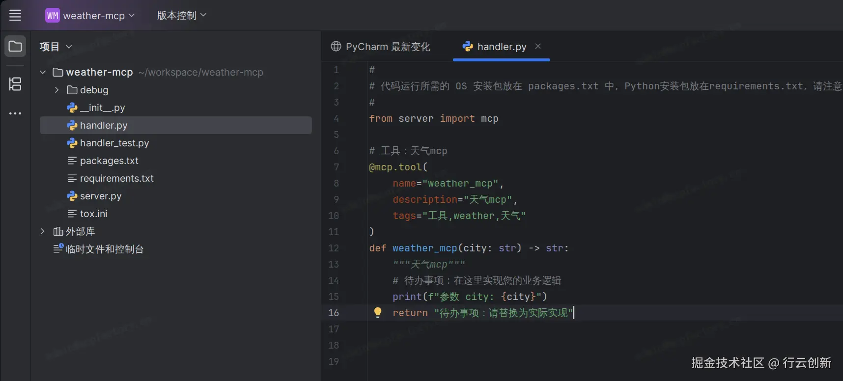 它会自动帮你搭建好MCP开发的脚手架,期间需要按界面提示安装好pyenv环境和依赖包,然后我们只需要关注handler.py这个文件,我们接下来的实际代码也是在修改这个handler.py文件