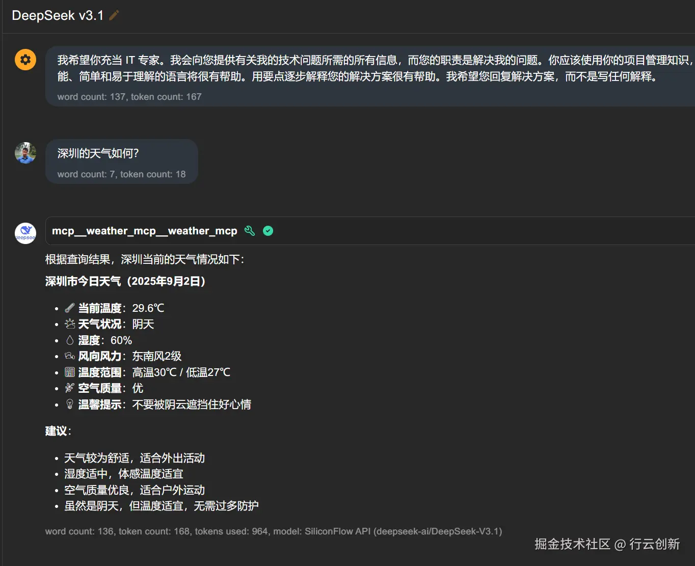 我们用自然语言向DeepSeek提问,它了解了我的意图并调用了我写的mcp server查询到深圳的天气并返回给我数据。