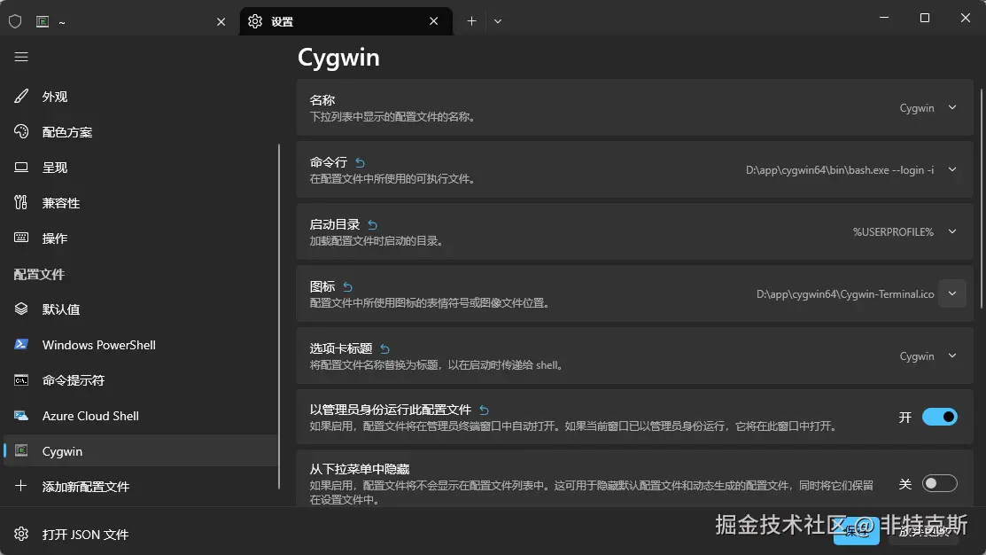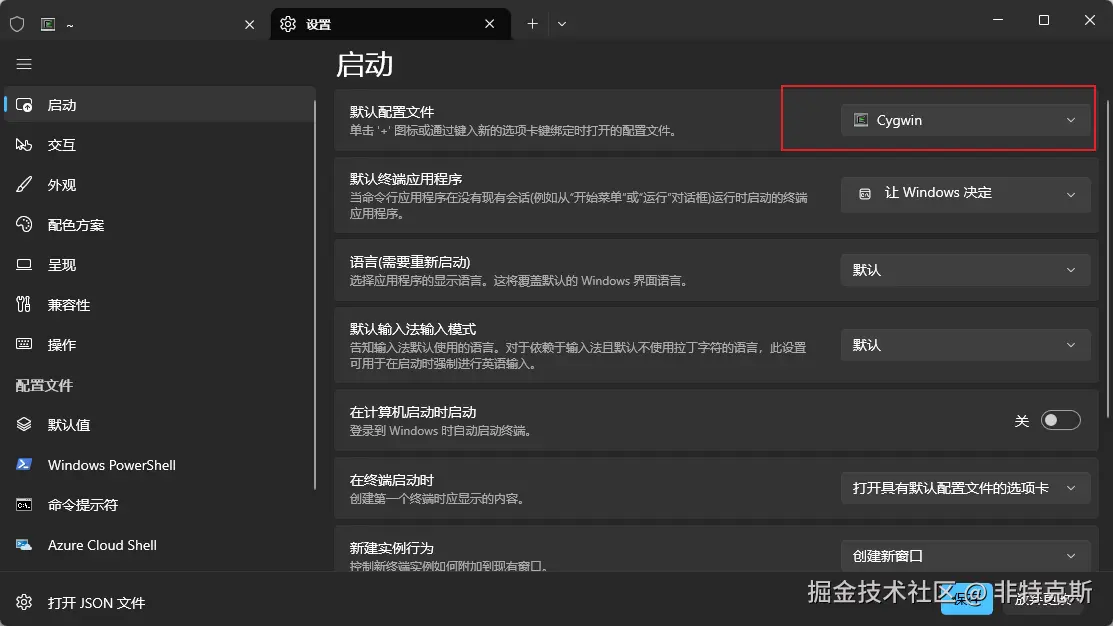 可在启动配置中,让windows terminal默认打开Cygwin。