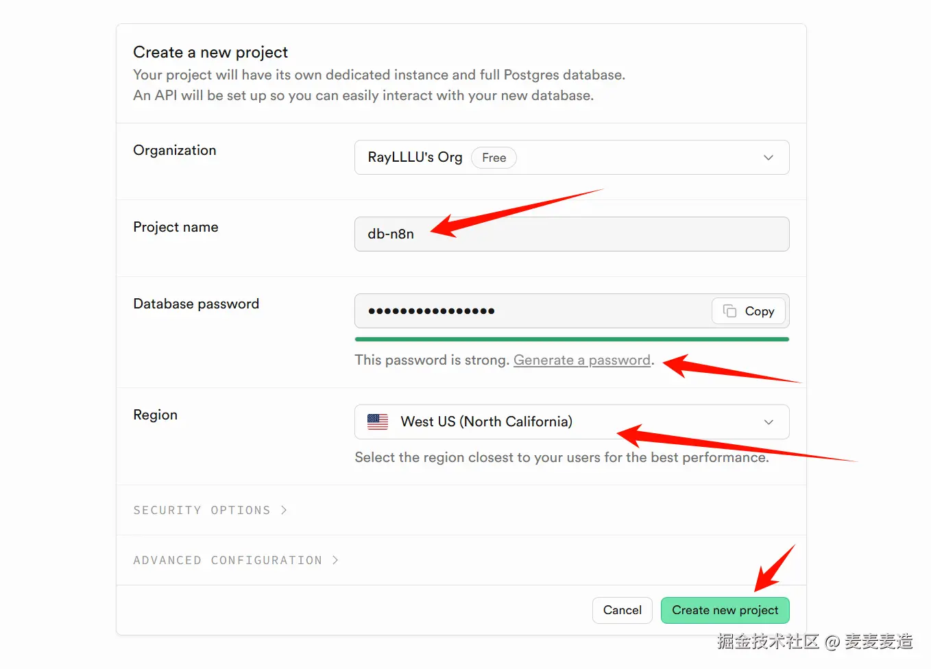 DB_POSTGRESDB_PASSWORD | [你的 Supabase 密码] | 你在创建 Supabase 项目时设置的数据库密码。 |