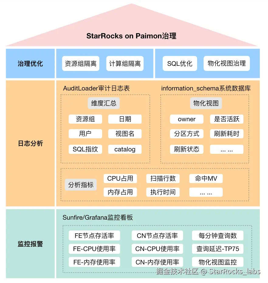 - 大查询管理:利用社区提供的工具及 StarRocks 自身的组件实现集群监控报警和诊断分析的可视化管理,并使用 SQL 优化、资源隔离等方式来保障集群的持续稳定性。