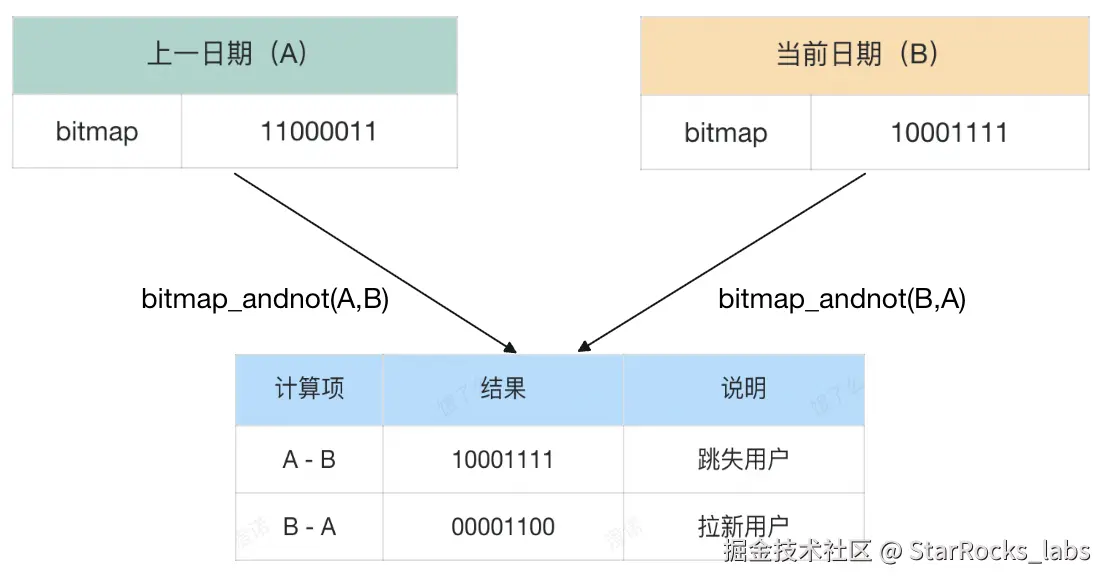 差集计算适用于指标语义中含有“非”、“但”的逻辑,如计算前一日访问但当日未访问的用户,则可以将前一天的访客Bitmap 与当日访客 Bitmap 进行差集计算,从而找到当日跳失用户,如下: