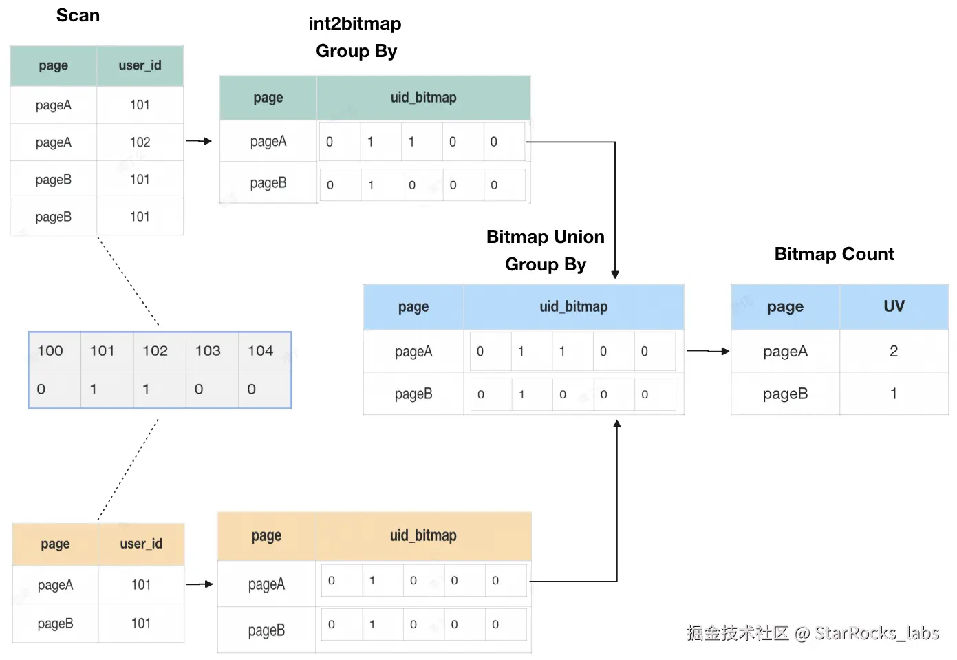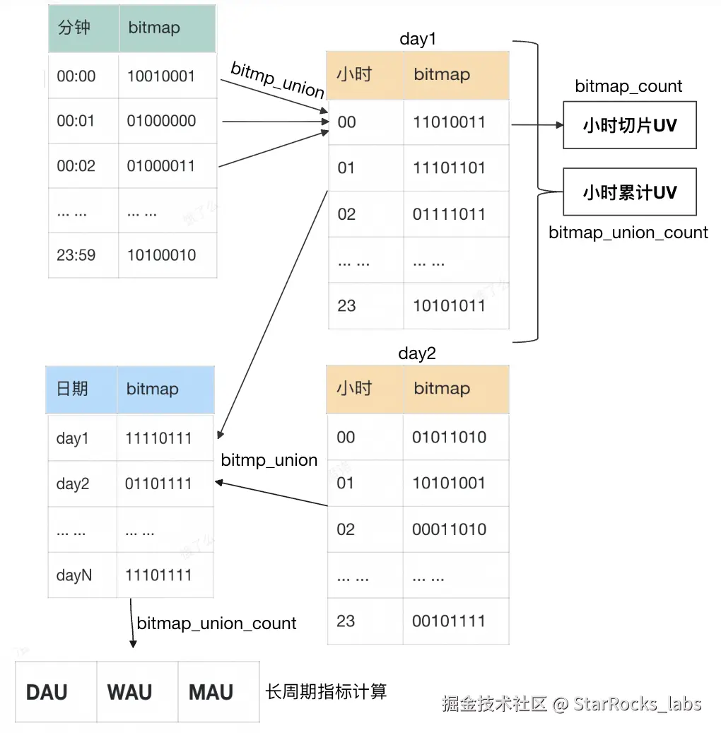 - 如业务需要查看多天趋势,可以继续向下 bitmap_union 为小时或天粒度的 Bitmap。