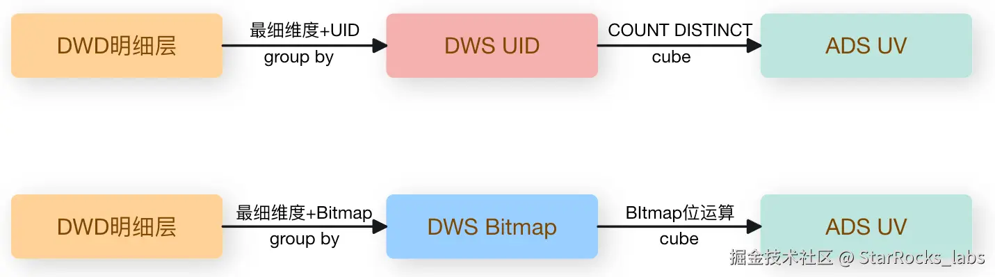 - 中间做一层最细粒度的 DWS 轻度聚合层,下游再加工出常用维度+单维度的 Bitmap;
