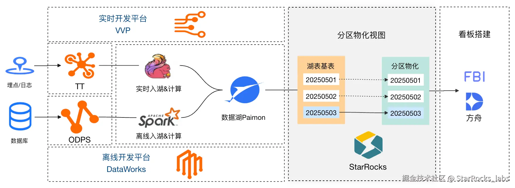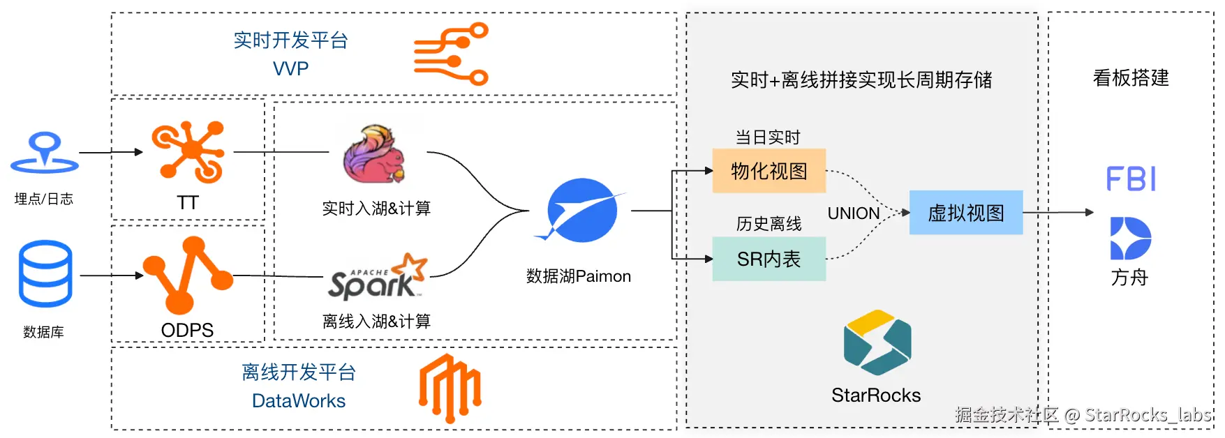 两者结合可以实现 1+1 远大于 2 的效果。淘宝闪购项目作战期间,BI 与业务运营想要查看当日流量漏斗及各渠道投放转化效率,以便及时进行分析汇报和调整运营策略。我们将实时流量数据通过 Flink 入湖,维表数据通过 Spark 入湖,StarRocks 作为计算引擎直接查询Paimon湖表,FBI接入SQL数据集搭建实时看板,快速解决了业务实时看数需求。