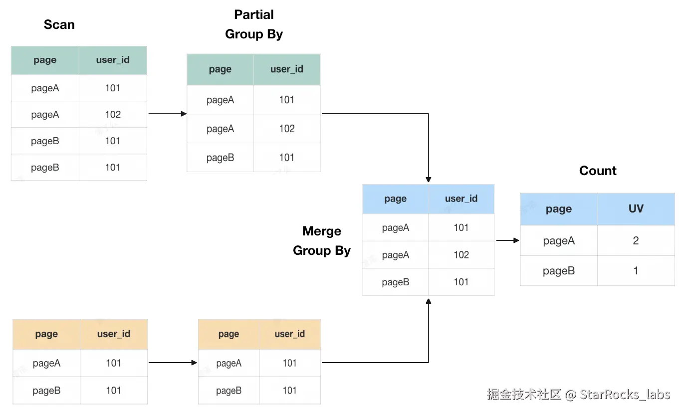 我们以6行数据在两个节点上计算来举例,在传统的 Count Distinct 去重方案中,由于数据需要进行多次 shuffle,当数据量越来越大时,所需的计算资源就会越来越多,查询也会越来越慢。