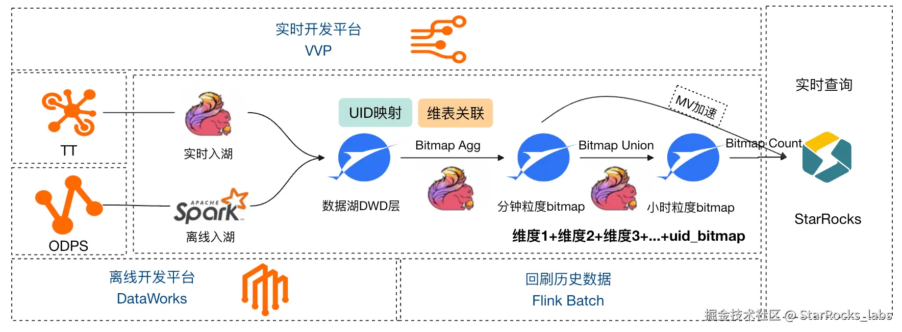 - RoaringBitmap 去重:针对超大数据量多维度实时交叉去重指标计算场景,团队引入RoaringBitmap 技术,结合Paimon 的流读流写能力和 StarRocks 丰富的 Bitmap 函数支持,在保障查询性能的同时,业务可以查询实时数据进行任意维度的灵活分析
