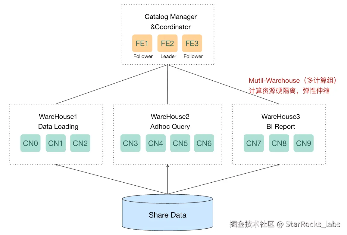 业务实践过程中,通过资源组来实现业务间的资源隔离尤其是 CPU 资源有时并不能达到理想的效果,由于其软隔离的特性,我们始终无法在同一个实例中完全隔离出一部分 CPU 给到 P0 级业务。于是,我们继续尝试了阿里云 EMR StarRocks 存算分离版本计算组(Mutil Warehouse)隔离能力,将物化视图刷新任务与 SQL 查询任务进行隔离。即在同一个实例中共享一份数据存储,共享 FE 节点的查询规划和资源调度,将 CN 节点进行物理隔离,满足读写分离场景和不同业务负载需求,同时支持根据实际业务需求动态调整资源,确保资源高效利用并降低成本。