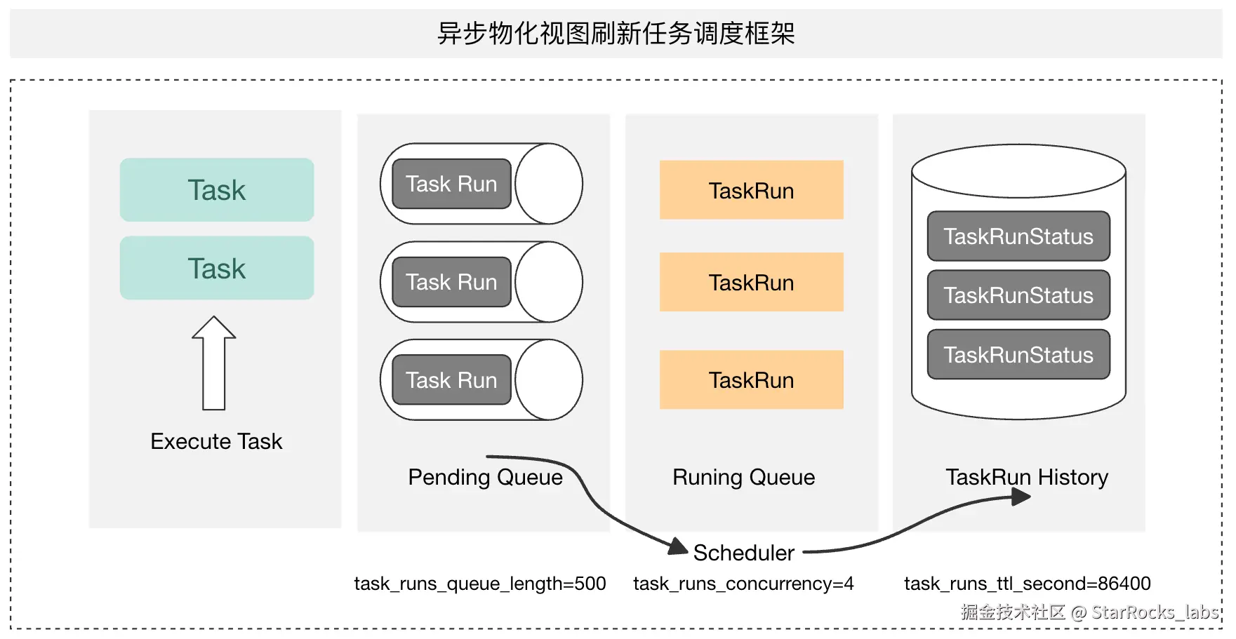 异步物化视图的调度框架主要有两个核心概念:Task 是周期运行的刷新任务,TaskRun 为每次刷新周期的运行实例。我们可以通过系统参数来设置 TaskRun 的最大 Pending 数量,Running 的并发数量及生命周期等。