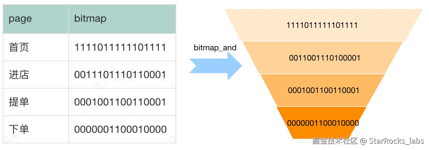 首页-->进店-->提单-->下单是业务常用的转化率分析链路,但每个页面流量单独统计出的结果并不准确。以首页-->进店为例,部分外投渠道链接可能直接跳到店详页而不经过首页。业务想要看到精确的漏斗数据,只能使用 UID 进行串联。假设我们有一张页面维度的 Bitmap 表,则可以通过 case when+bitmap 交集计算来进行访购链路的漏斗分析。