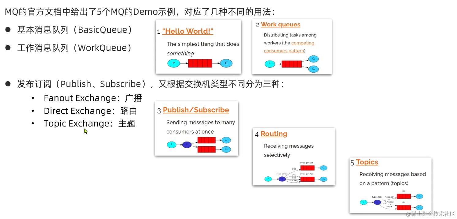 RabbitMQ官方提供了5个不同的Demo示例,对应了不同的消息模型: