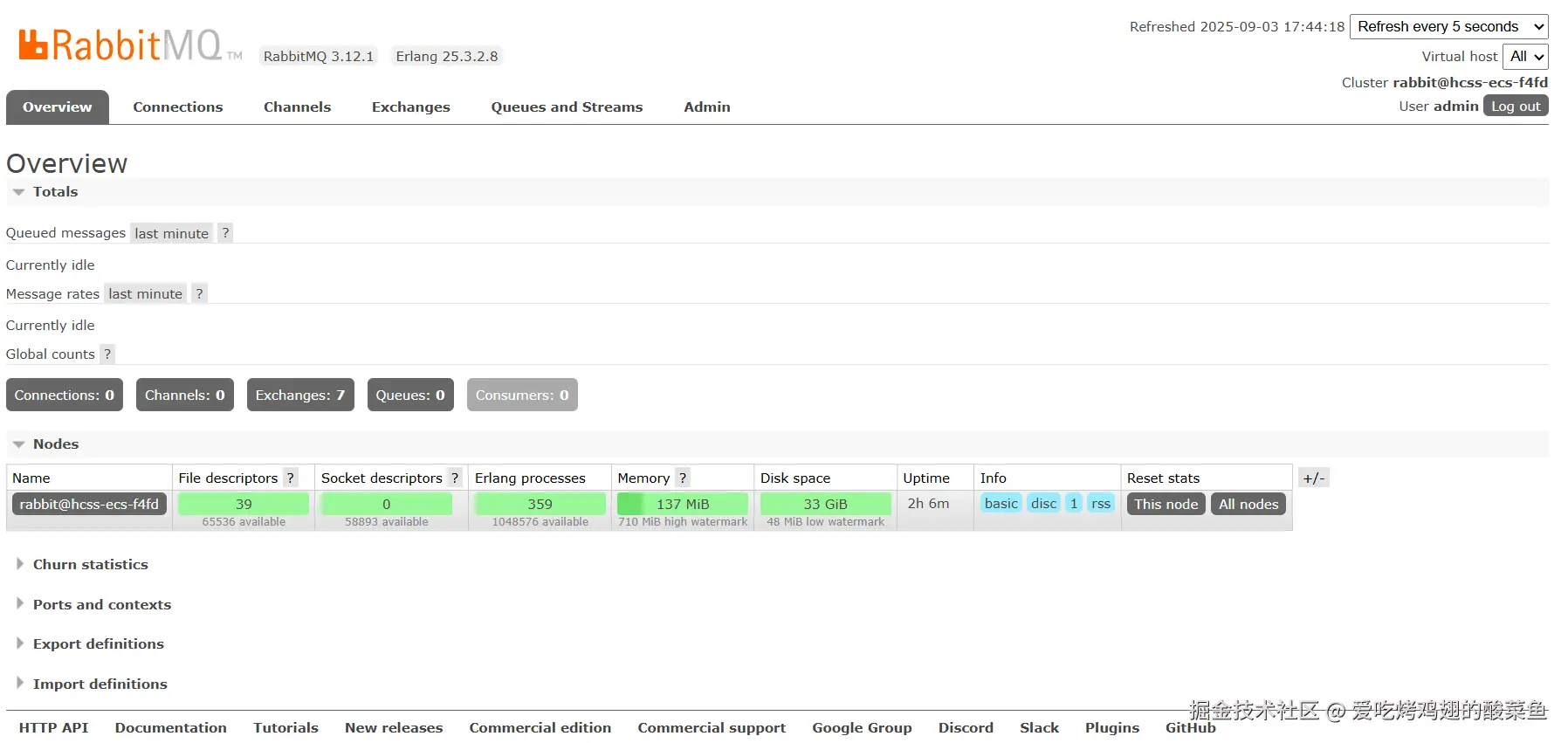 随后通过浏览器访问 RabbitMQ 管理界面(默认地址 http://服务器IP:15672),使用创建的 admin 用户及密码登录,验证节点状态、连接数及队列指标是否正常。
