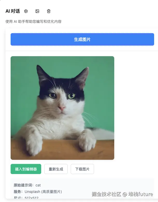 只需要点击插入到编辑区按钮即可,这样图片自动就到编辑区域了,那我们将最后一张猫的照片插入到编辑区之后如下展示: