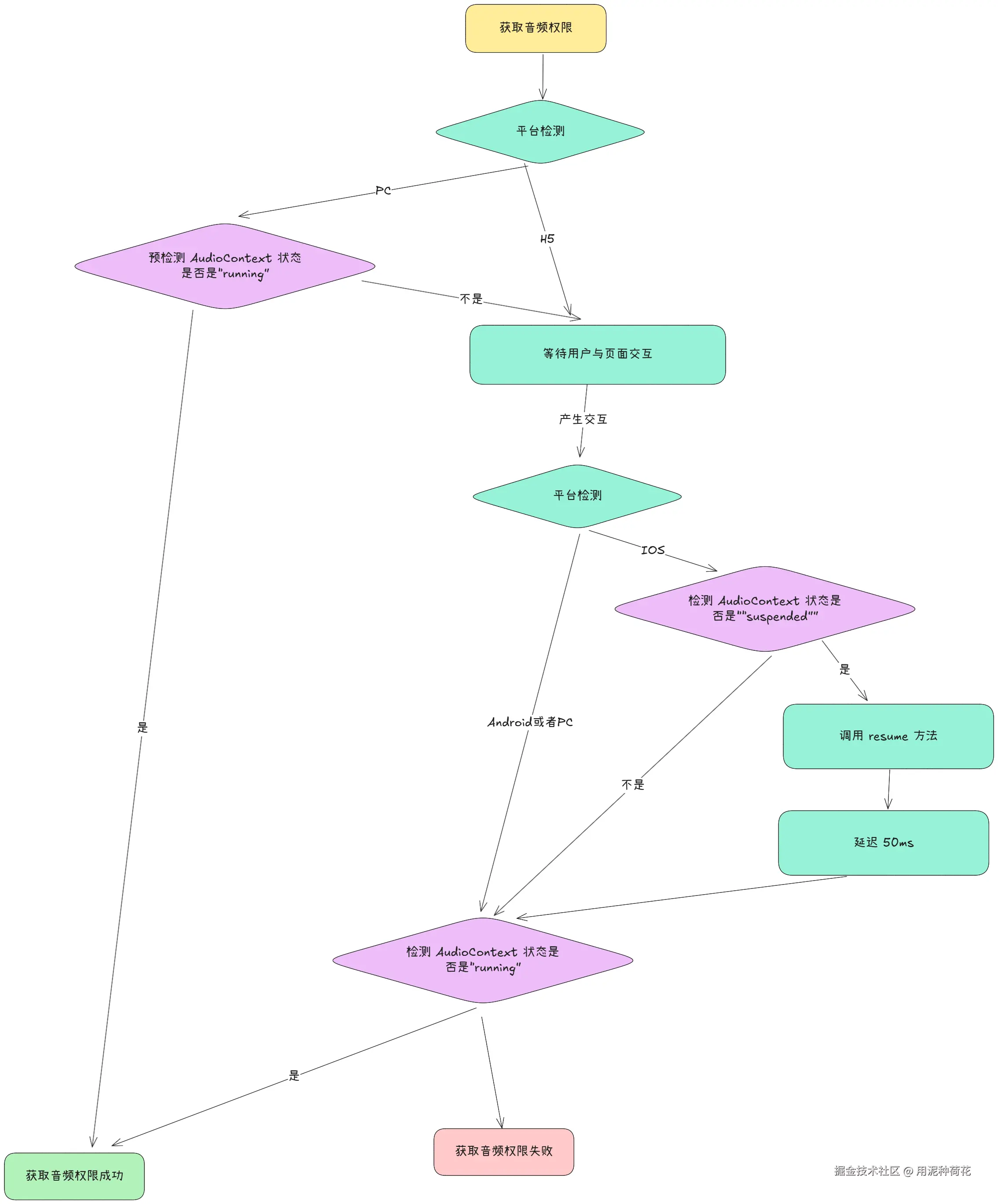 AudioContext状态也不会直接变成running,仍需如下操作:- 调用