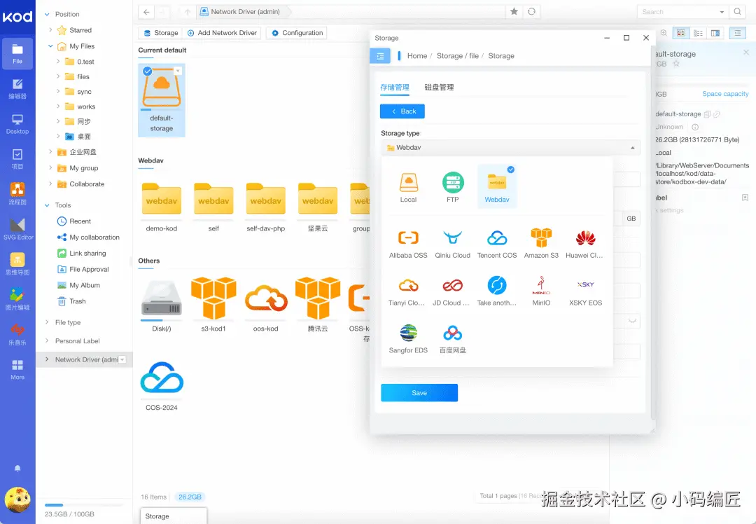 23、多存储融合:支持挂载本地磁盘、FTP、WebDAV及阿里云OSS、腾讯云COS、MinIO、S3等对象存储,实现跨云统一管理。