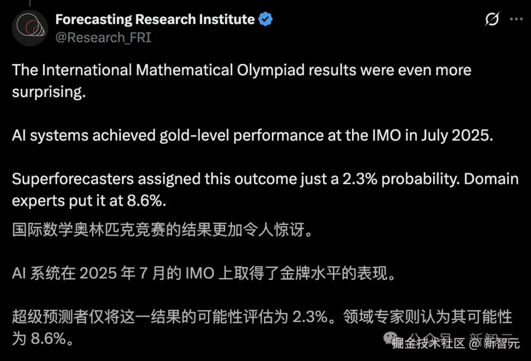 「【新智元导读】2022 年,专家们笃定 AI 到 2025 年赢得 IMO 金牌概率不足 10%。谁料短短 3 年,OpenAI 和谷歌 DeepMind 的 LLM 双双摘金,不仅打破纪录,更宣告群体智能时代的到来!AI 震撼人心,巨变势不可挡。」