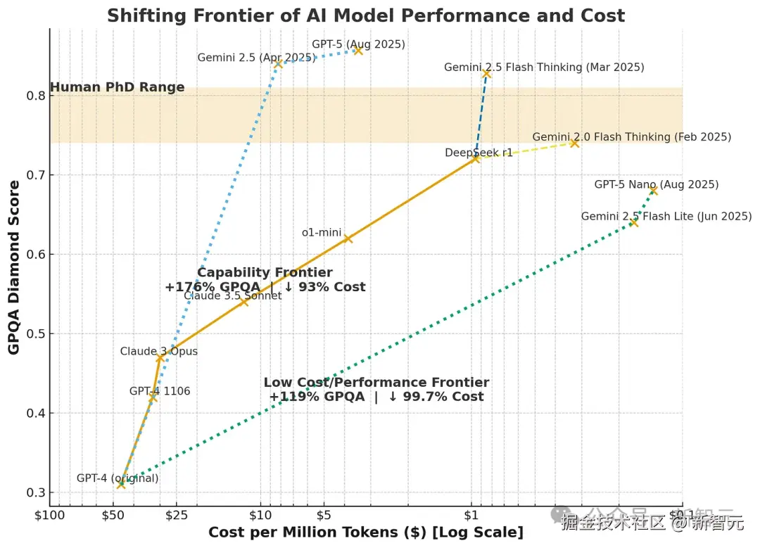 AI 变得越来越聪明,但运行成本却急剧下降。下图直观展示了这一趋势。
