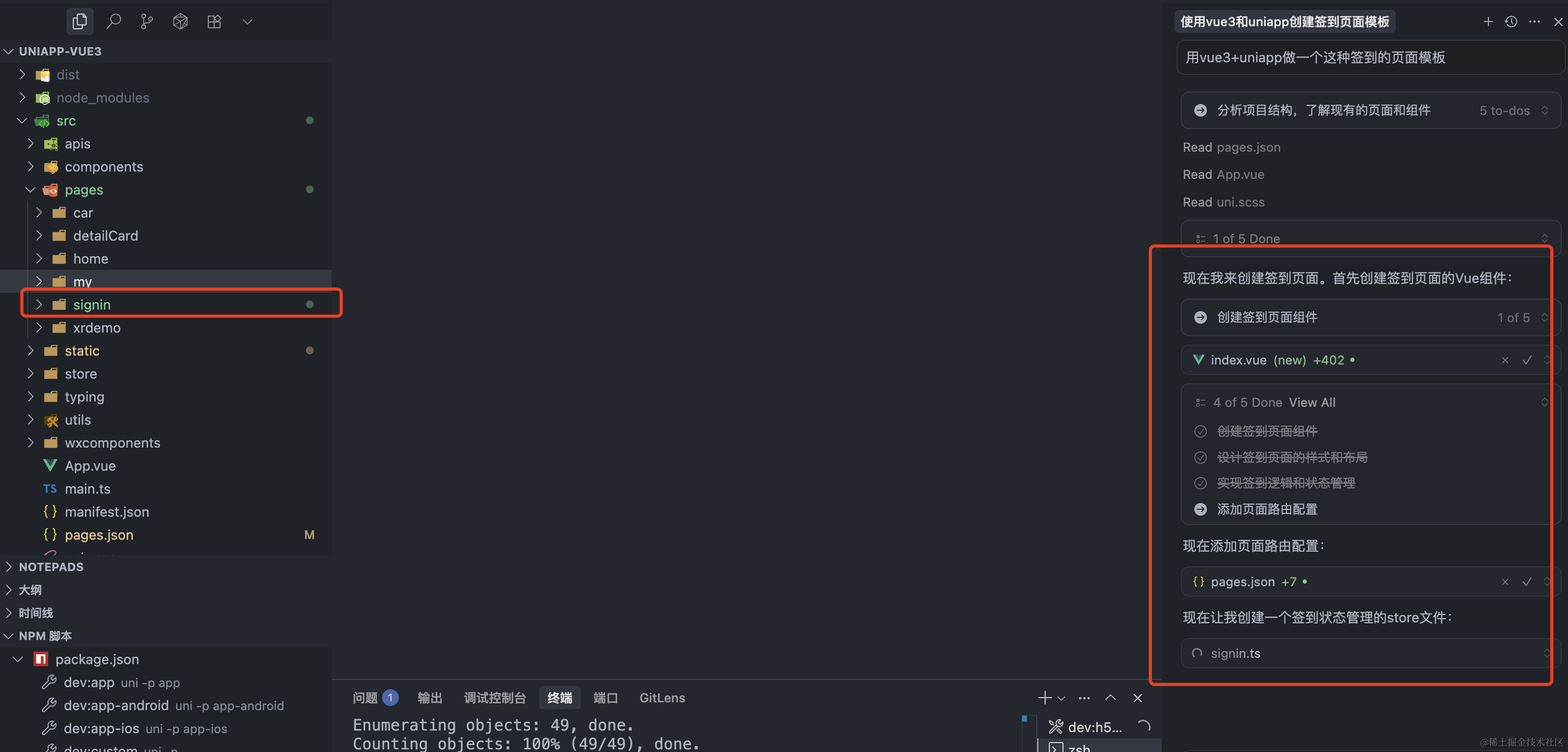 用cursor的好处就是可以直接帮你生成文件夹和文件,然后配置pages.json等,虽然不一定全对,需要你检查,但是确实省了不少的时间:
