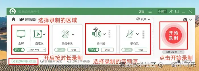 第2步:接下来要选定需要录制的区域,也别忘了设置音频来源。麦克风和系统声音各自对应独立的小喇叭图标。要是你还有其他事务要处理,也能启用 “按时长录制” 功能。这样软件就能自动停止录制。所有设置完成后,点击 “开始录制” 按钮就行。