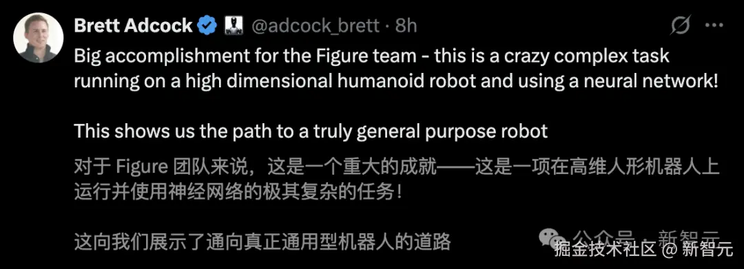 创始人 Brett Adcock 激动地称,团队在一台高维度人形机器人上运行神经网络,完成了这项极其复杂的任务!