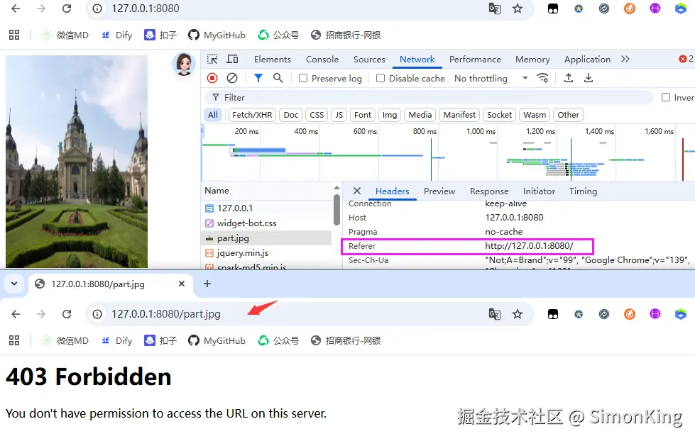 Referer字段表示这个请求是从哪个页面发起的。- 如果一张图片应该只在