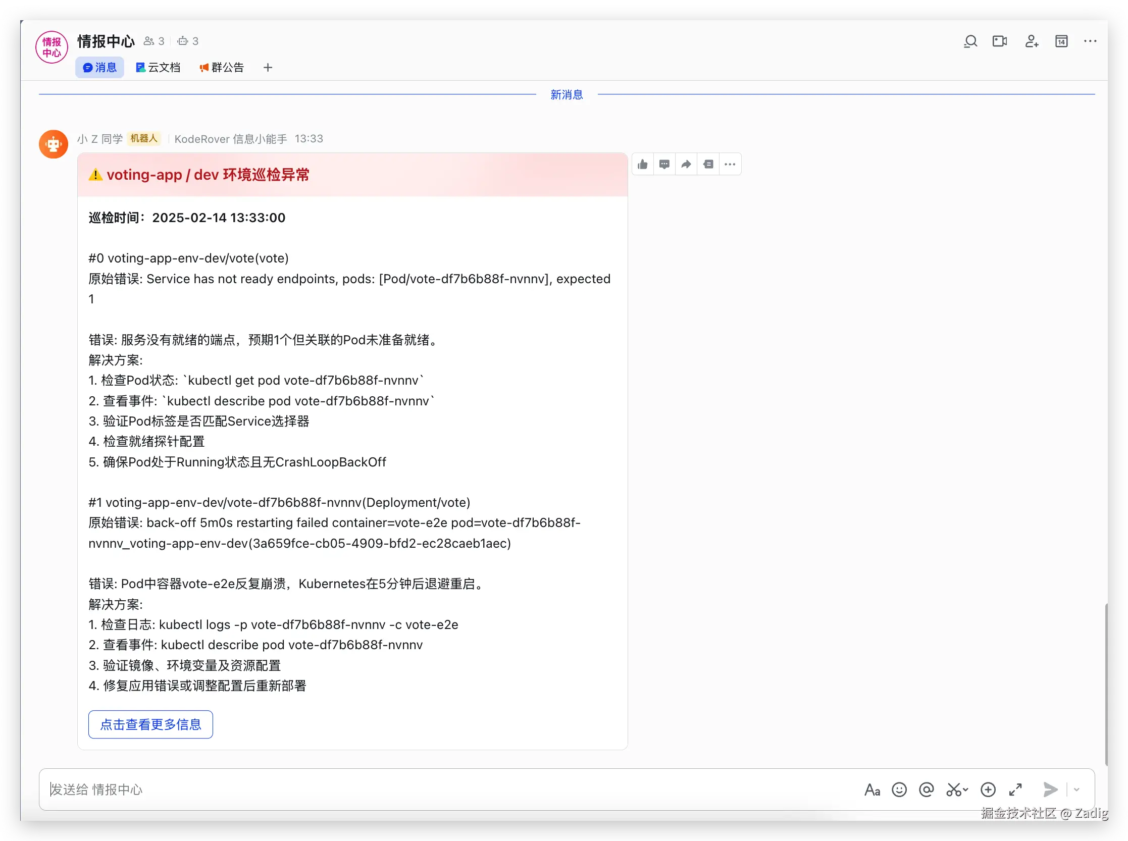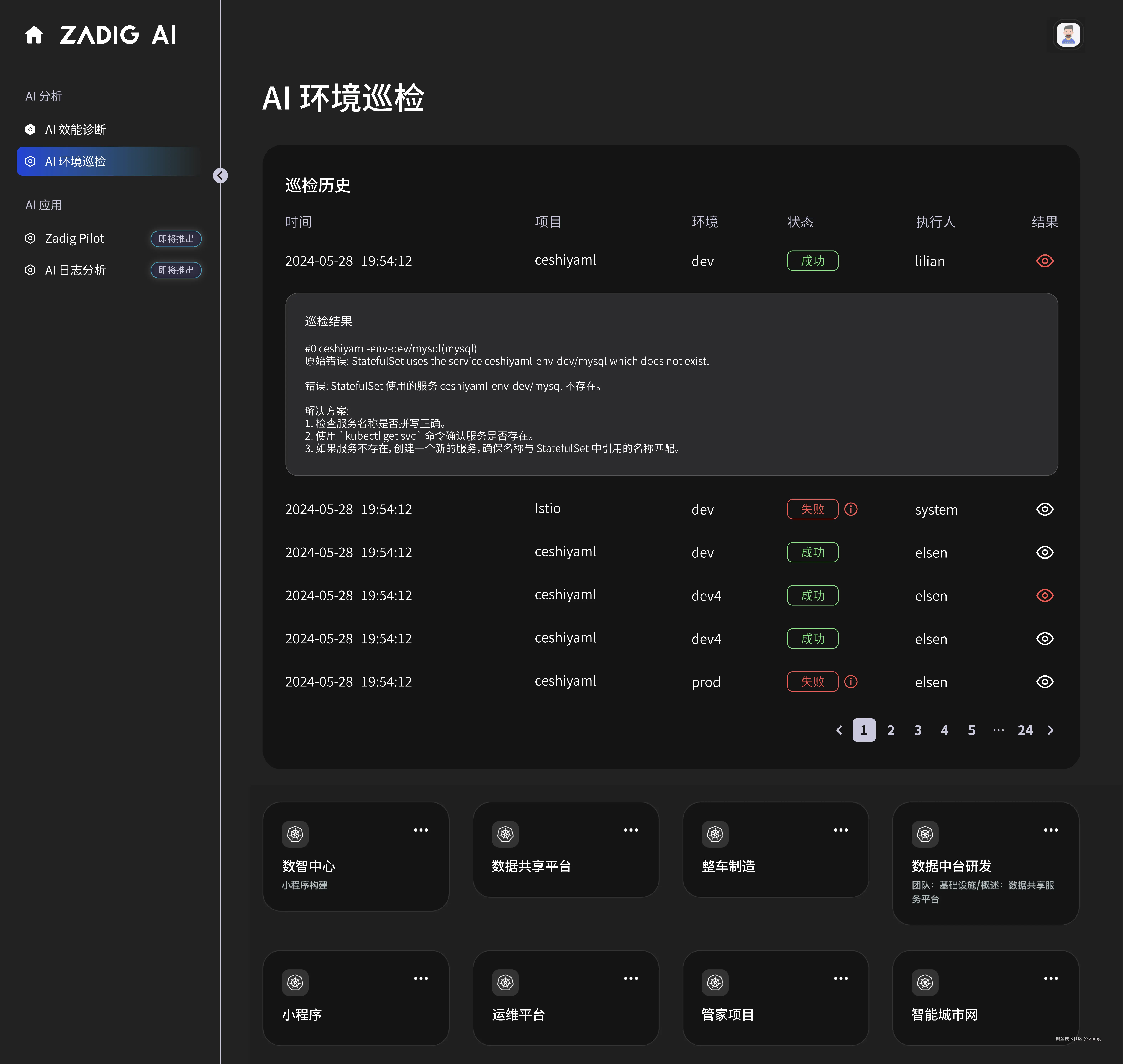 - AI 环境巡检 通过 AI 能力全面分析和识别 Kubernetes 环境中的问题,如 Pod 异常、配置错误等,并提供解决方案。用户可以在 Zadig 上配置定时器和 IM 通知,实现定时巡检,及时将问题和解决方案发送给对应的负责人,极大地提高了运维效率和系统的稳定性。