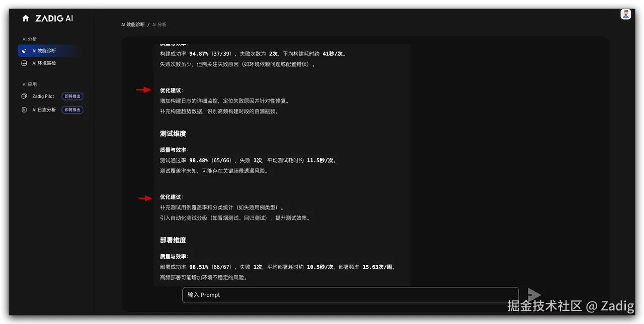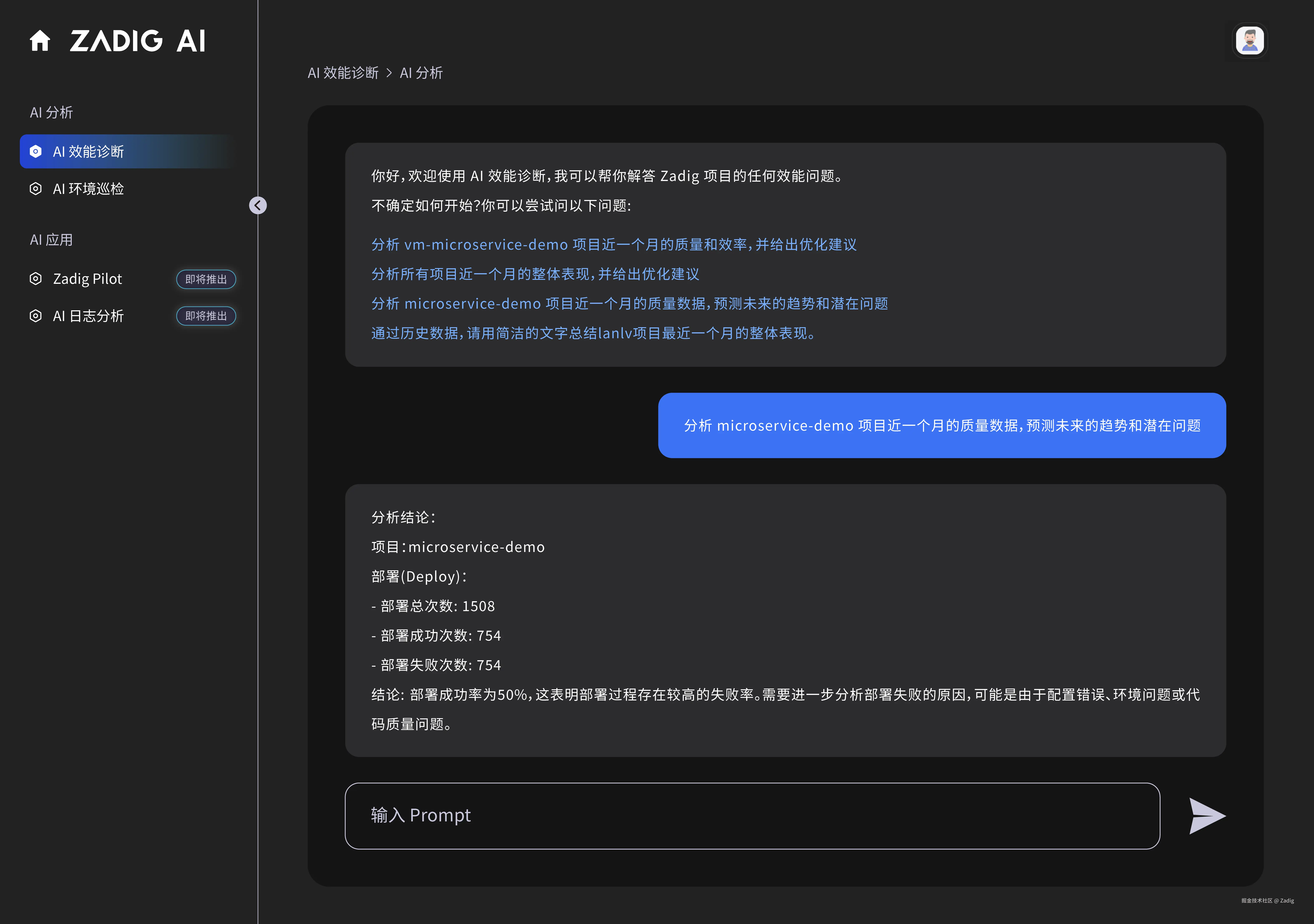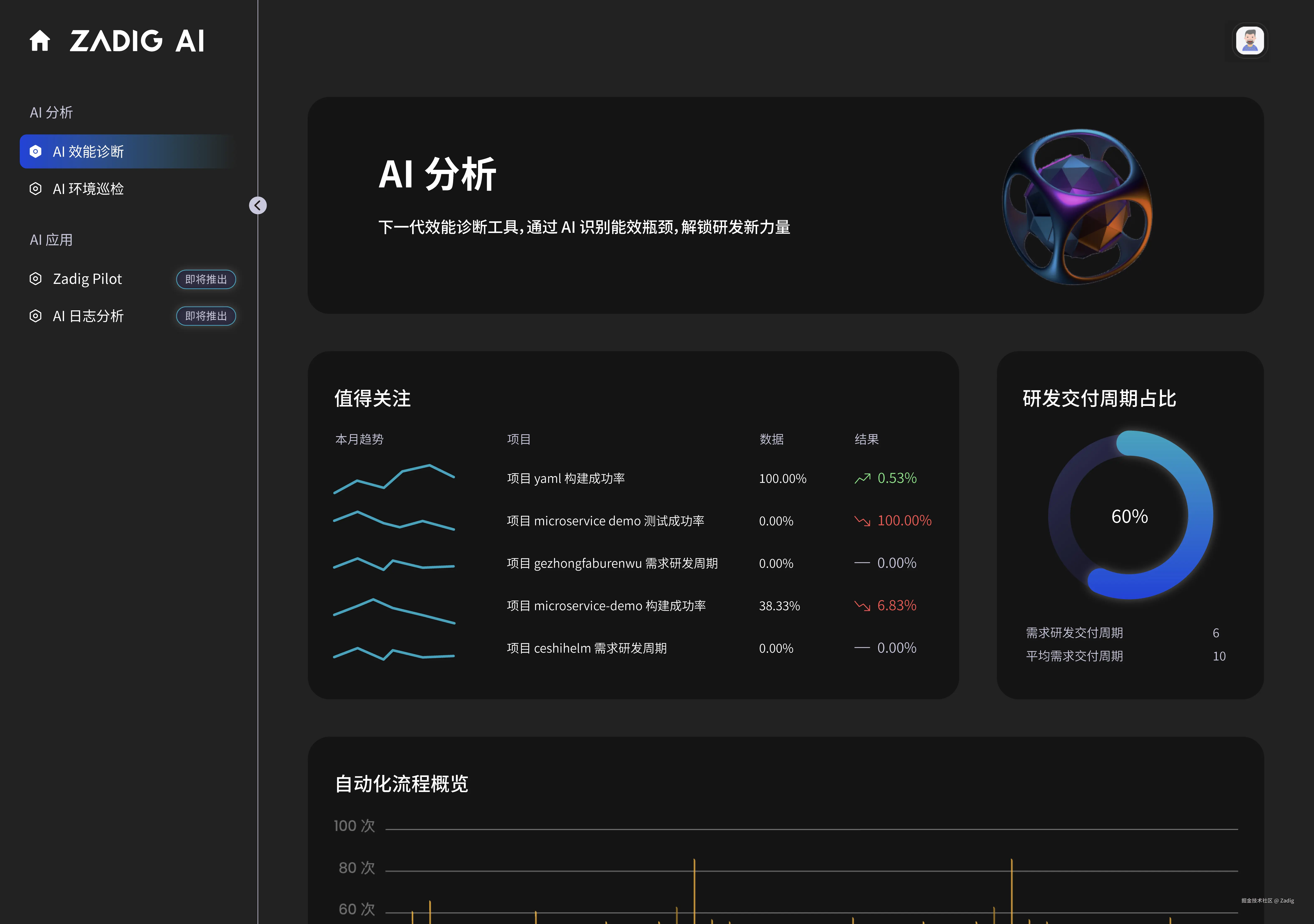 - AI 效能诊断 基于 Zadig 上产生的效能数据,AI 辅助分析可以精准定位项目效能问题,并给出改进建议。与传统手动分析大量数据的方式相比,AI 能在较短时间内自动生成报告,为企业节省了大量时间和人力成本。