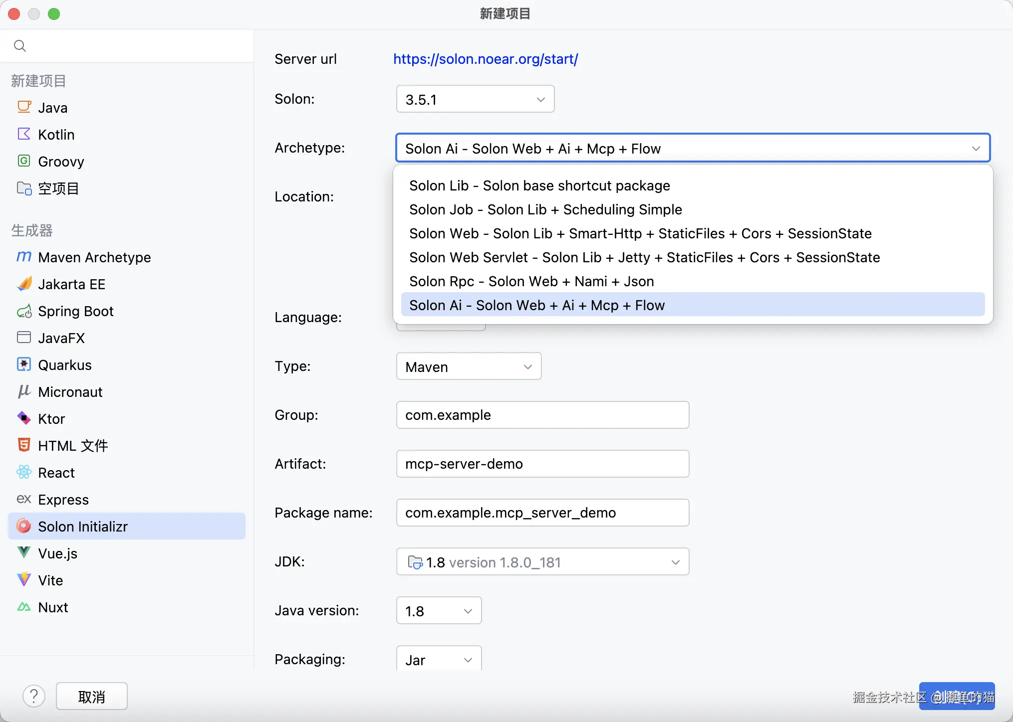 创建时选择 Archetype 为 Solon AI(可以减少些活),会自动添加 Solon AI、MCP 相关依赖。