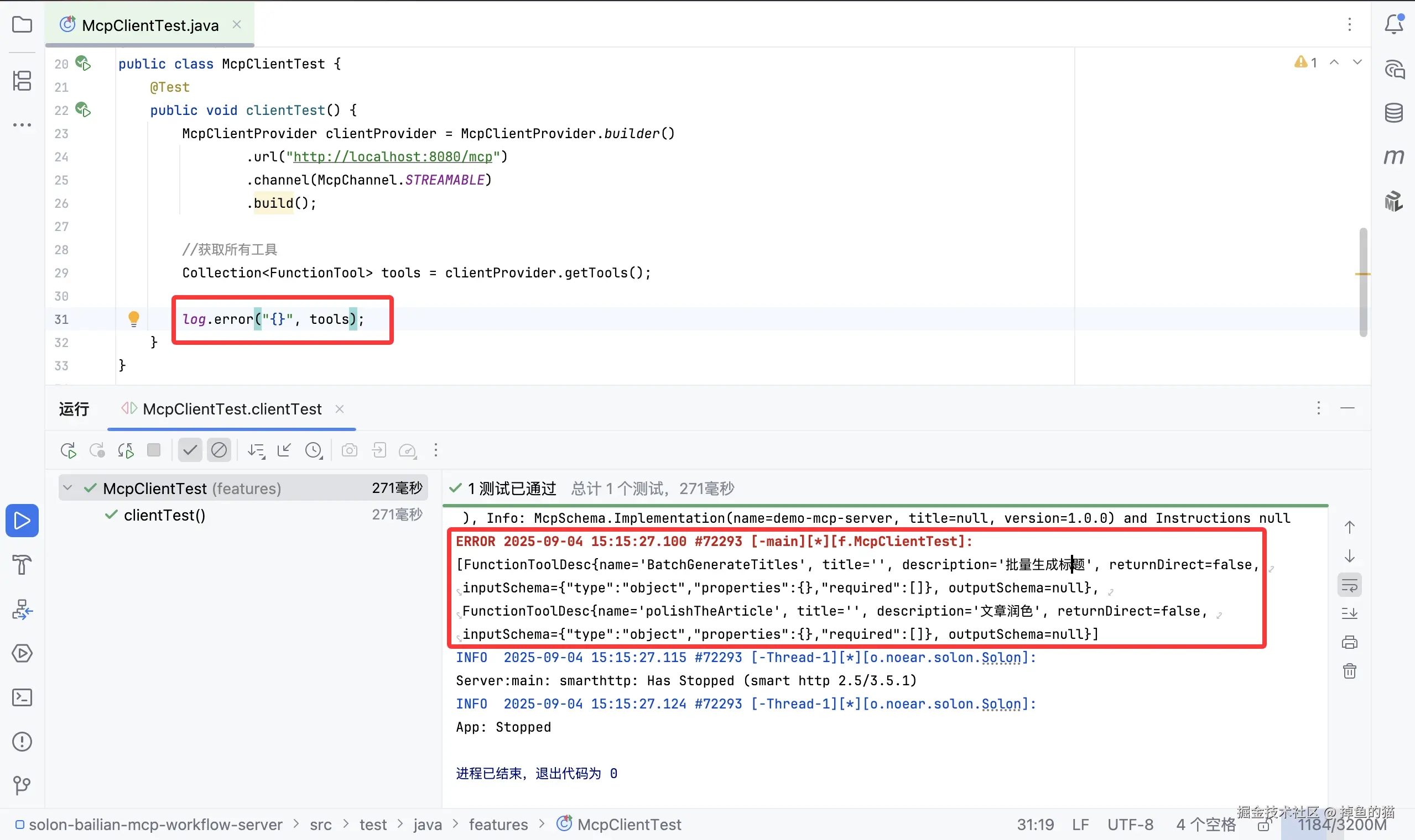 通过测试注解 @SolonTest(App.class) 启动服务端,通过 McpClientProvider 连接服务端并获取所有工具。