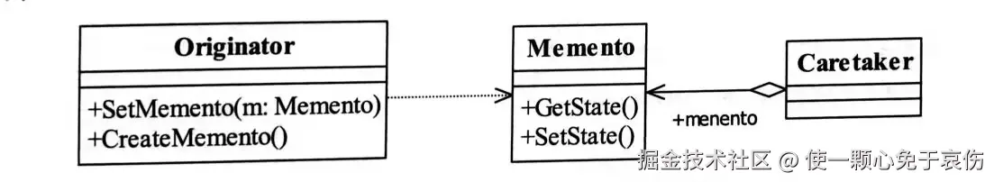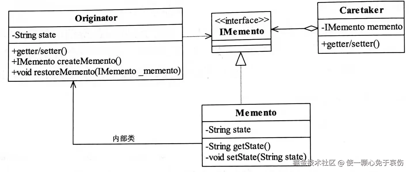 建立一个空接口IMemento,什么方法属性都没有的接口,然后在发起人Originator类中建立一个内置类(也叫做类中类)Memento实现IMemento接口,同时也实现自己的业务逻辑