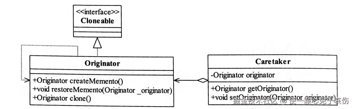 我们可以通过复制的方式产生一个对象的内部状态,这是一个很好的办法,发起人角色只要实现Cloneable就成,比较简单,我们来看类图: