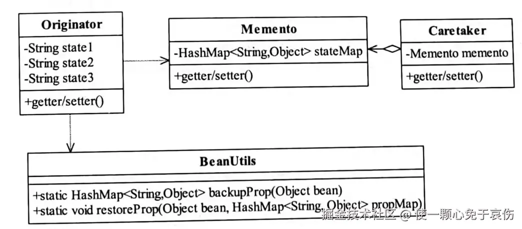 加了一个BeanUtils类,其中backupProp是把发起人的所有属性值转换到HashMap中,方便备忘录角色存储;restoreProp方法则是把HashMap中的值返回到发起人角色中。可能各位要说了,为什么要使用HashMap,直接使用Originator对象的拷贝不是一个很好的方法吗?可以这样做,你就破坏了发起人的通用性,你在做恢复动作的时候需要对该对象进行多次赋值操作,也容易产生错误。