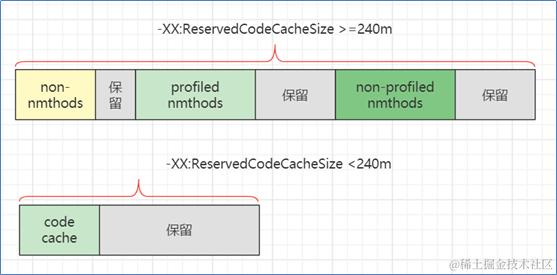 - 如果 -XX:ReservedCodeCacheSize < 240m,所有优化机器代码不加区分存在一起