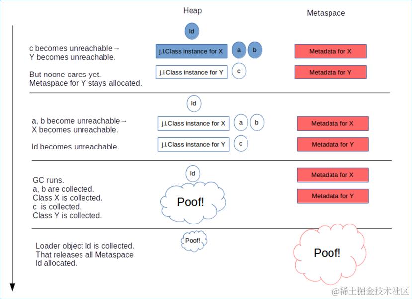 - 堆内存中:当一个类加载器对象,这个类加载器对象加载的所有类对象,这些类对象对应的所有实例对象都没人引用时,GC 时就会对它们占用的对内存进行释放
