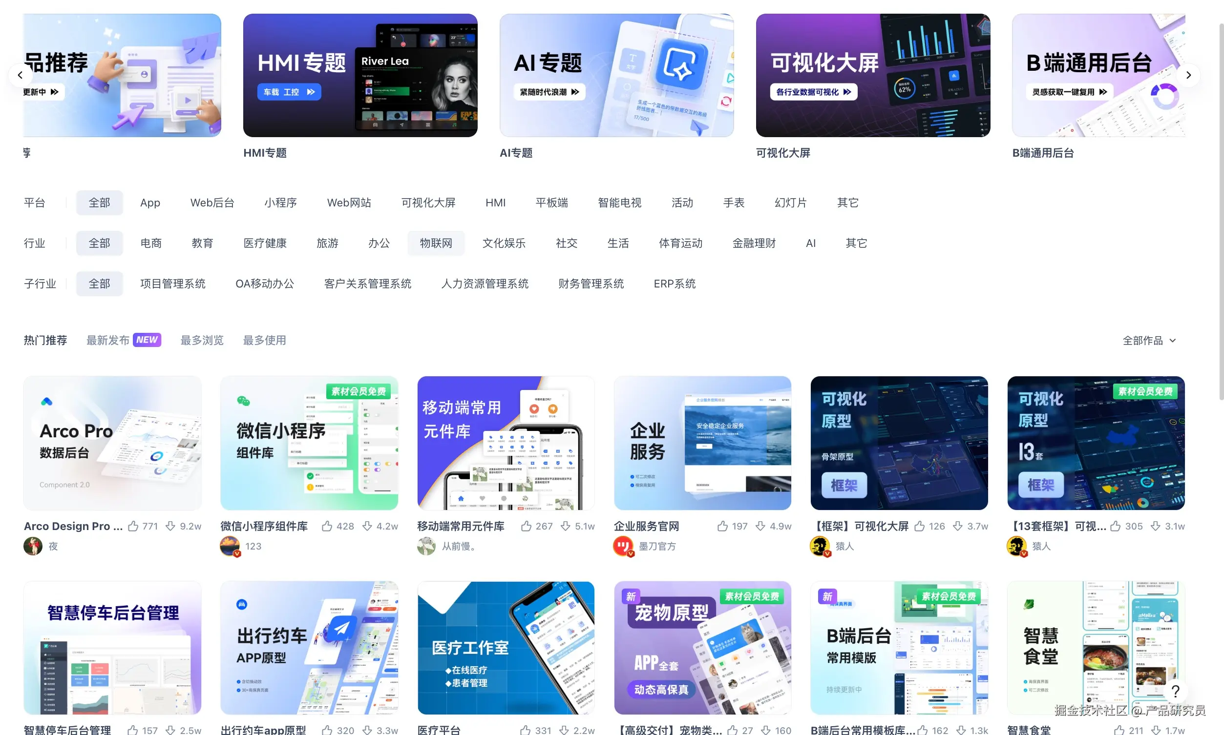 - 墨刀工具内置了一个素材广场,拥有上万素材模板资源,可以按照行业或者产品类型查找合适素材,支持产品经理上传作品分享,整体素材更新快、贴近国内市场需求,且内容较为前沿;