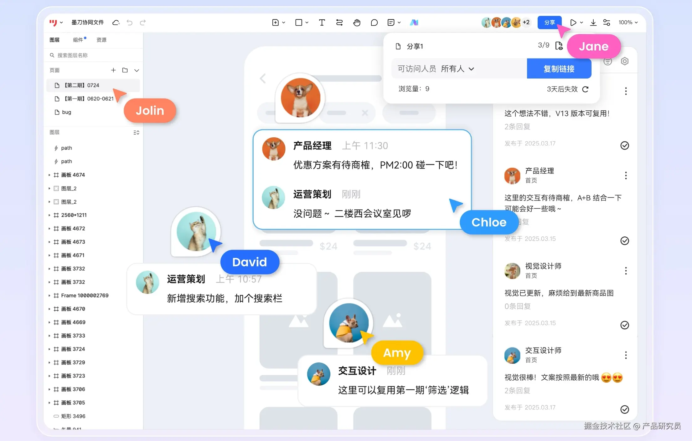 - 墨刀与Figma都是在线协作工具,在协作能力方面表现出色,都支持多人在线共同编辑、评审,实时同步。只要将链接分享给团队成员,就可以轻松打开协同,或者发送给客户也能提前预览,相比Axure会更加方便,节省时间提高团队协作效率。